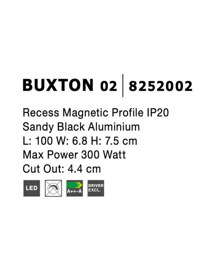 Срок на доставка: ПО ЗАПИТВАНЕ Продуктова информация Материал: Sandy Black Aluminium Тип крушка: Recess Magnetic Profile IP20 Max Power 300 Watt Код: 8252002 Тип продукт: MAGNETIC PROFILE Размери: L: 100 W: 6.8 H: 7.5 cm Cut Out: 4.4 cm