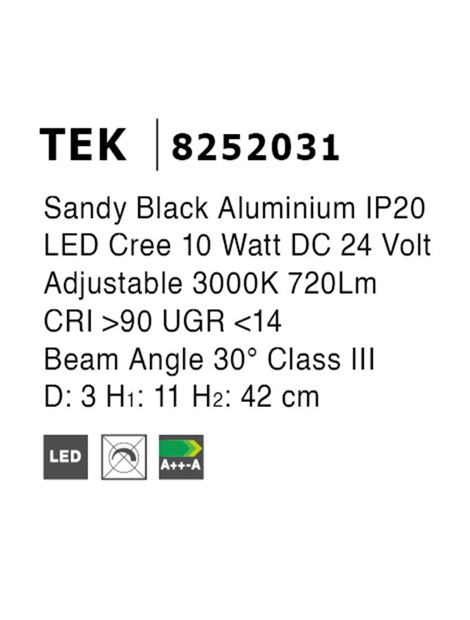 Срок на доставка: ПО ЗАПИТВАНЕ Продуктова информация Материал: Sandy Black Aluminium Adjustable Тип крушка: LED 10 Watt DC24V 720Lm 3000K IP20 Код: 8252031 Тип продукт: MAGNETIC PROFILE Размери: D:3 H1:11 H2:42 cm