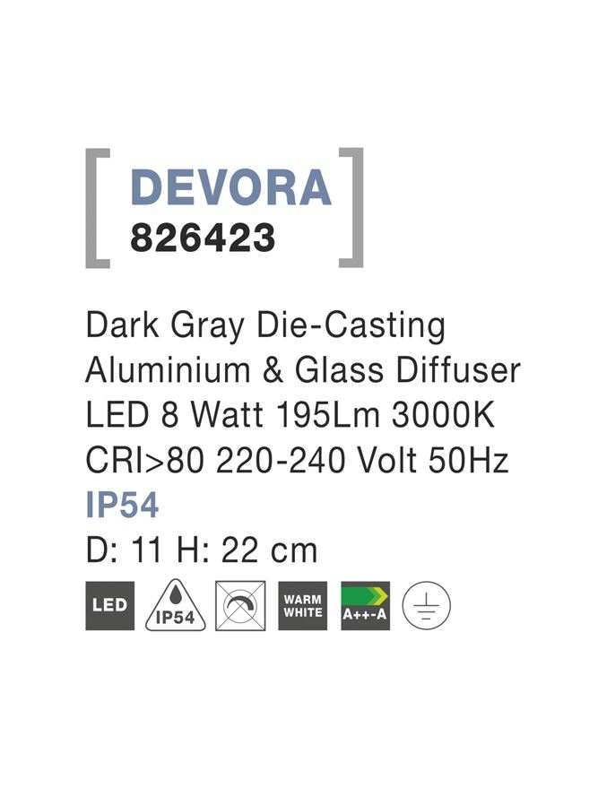 Dark Gray Die-Casting Aluminium & Glass Diffuser LED 8 Watt 195Lm 3000K 220-240 Volt 50Hz IP54 D: 11 H: 22 cm