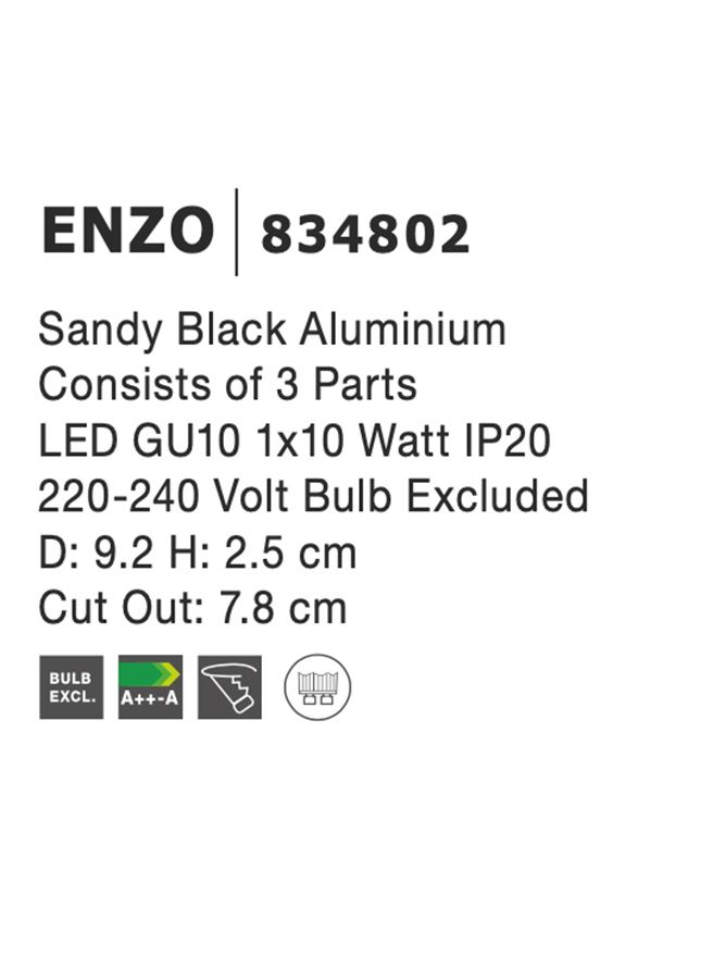 Sandy Black Aluminium Consists of 3 Parts LED GU10 1×10 Watt IP20 220-240 Volt Bulb Excluded D: 9.2 H: 2.5 cm Cut Out: 7.8 cm