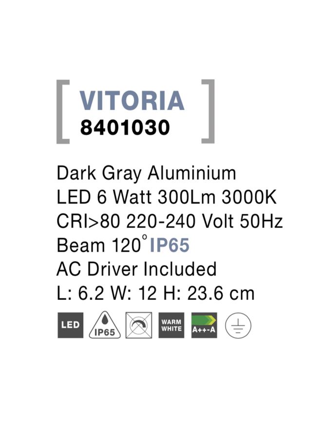 Срок на доставка: ПО ЗАПИТВАНЕ Продуктова информация Материал: Dark Gray Aluminium, AC Driver Included Тип крушка: LED 6 Watt 300Lm 3000K, 220-240 Volt 50Hz Beam 120 degrees -IP65- Код: 8401030 Тип продукт: OUTDOOR – WALL Размери: L: 6.2 W: 12 H: 23.6 cm