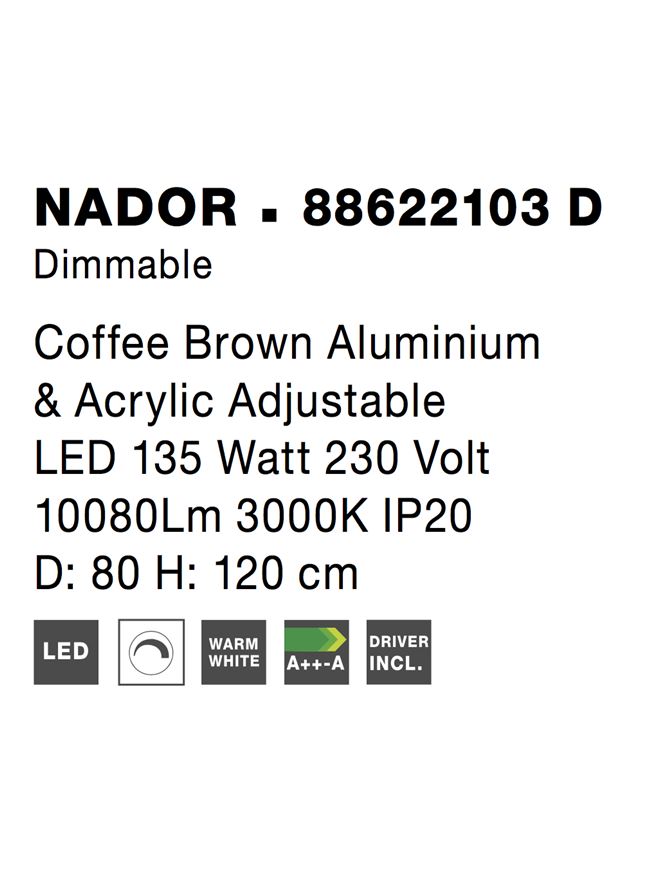 Срок на доставка: ПО ЗАПИТВАНЕ Продуктова информация Материал: Coffee Brown Aluminium & Acrylic Adjustable Dimmable Тип крушка: LED 135 Watt 230 Volt 10080Lm 3000K IP20 Код: 88622103 D Тип продукт: COMFORT Размери: D: 80 H: 120 cm