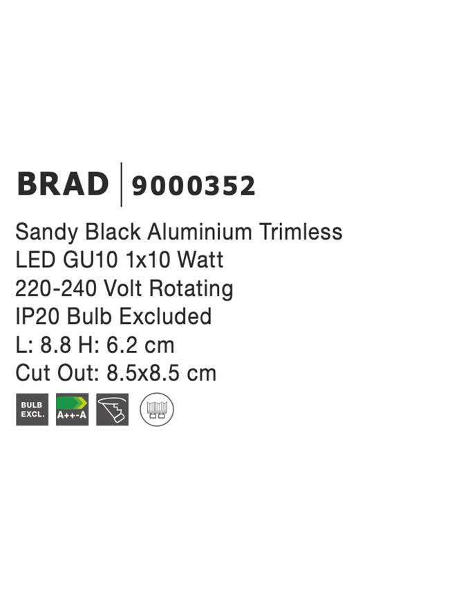 Sandy Black Aluminium Trimless LED GU10 1×10 Watt 220-240 Volt Rotating IP20 Bulb Excluded L: 8.8 H: 6.2 cm Cut Out: 8.5×8.5 cm