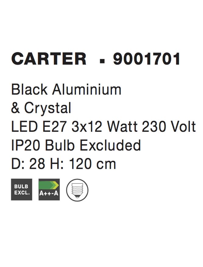 Срок на доставка: ПО ЗАПИТВАНЕ Продуктова информация Материал: Black Aluminium & Crystal Тип крушка: LED E27 3×12 Watt 230 Volt IP20 Bulb Excluded Код: 9001701 Тип продукт: WIRE Размери: D: 32 H: 120 cm