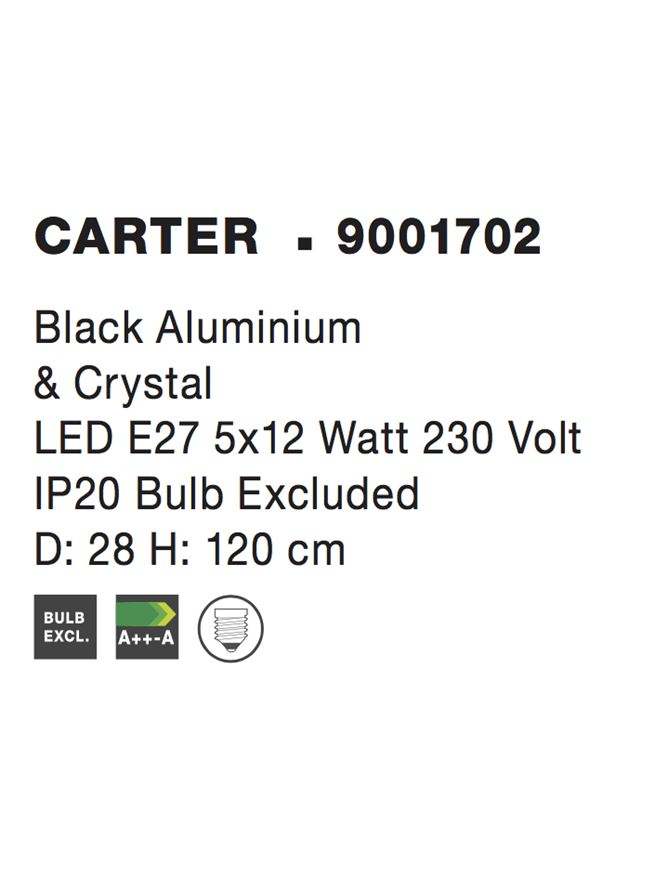 Срок на доставка: ПО ЗАПИТВАНЕ Продуктова информация Материал: Black Aluminium & Crystal Тип крушка: LED E27 5×12 Watt 230 Volt IP20 Bulb Excluded Код: 9001702 Тип продукт: WIRE Размери: D: 50 H: 120 cm