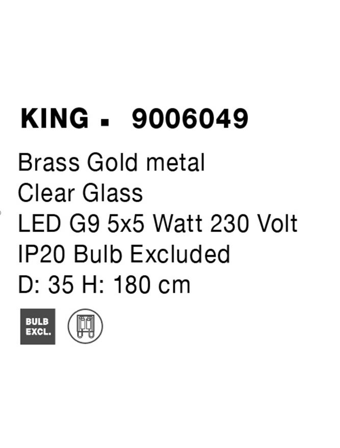Срок на доставка: ПО ЗАПИТВАНЕ Продуктова информация Материал: Brass Gold Metal Clear Glass Тип крушка: LED G9 5×5 Watt 230 Volt IP20 Bulb Excluded Код: 9006049 Тип продукт: MODERN PENDANT LUMINAIRES Размери: D: 35 H: 180 cm
