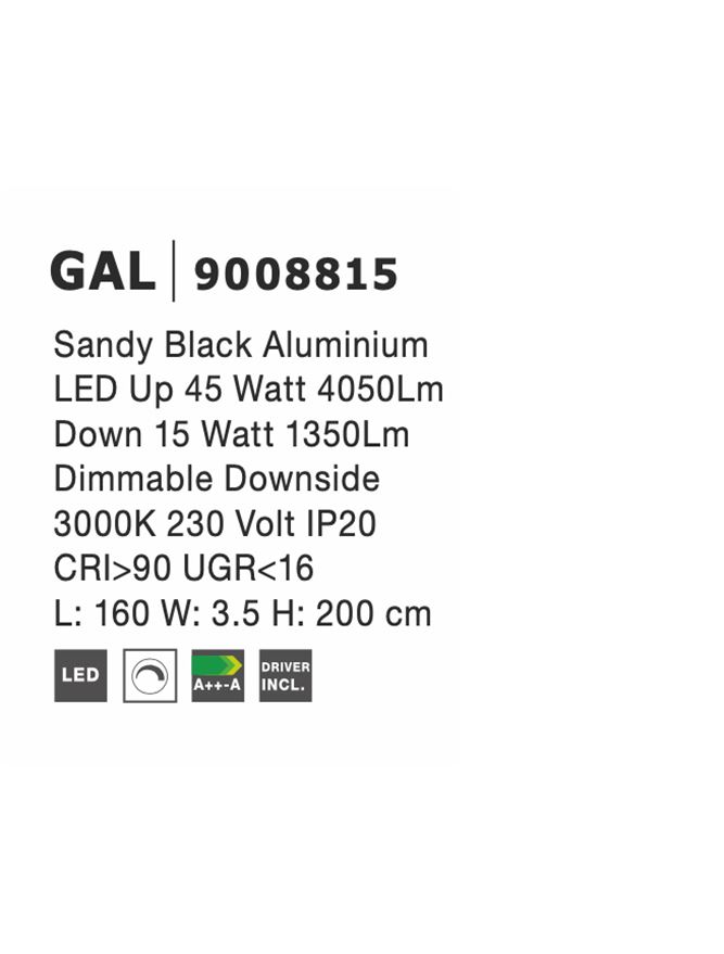 Sandy Black Aluminium LED Up 45 Watt 4050Lm Down 15 Watt 1350Lm Dimmable Downside 3000K 230 Volt IP20 CRI>90 UGR