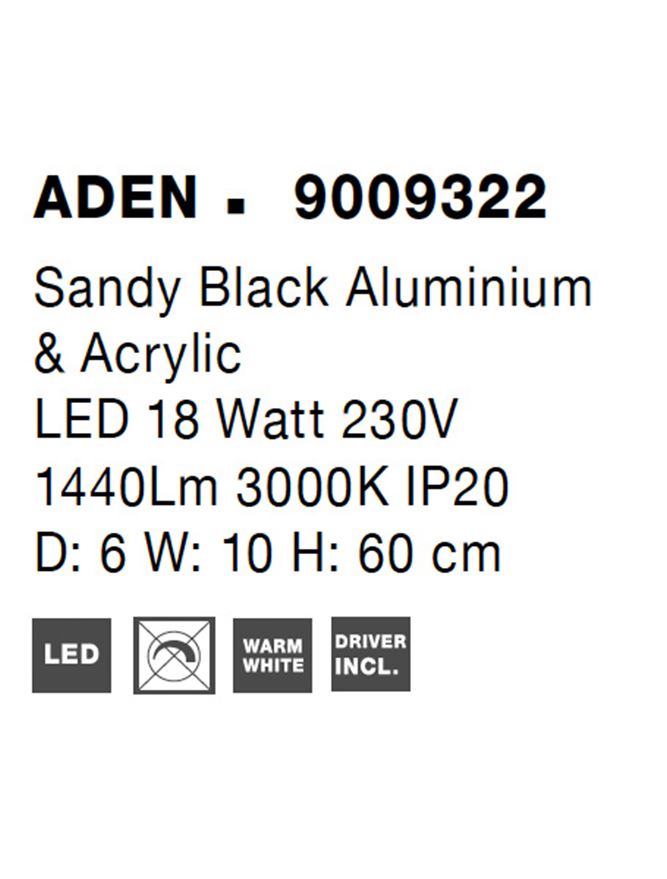 Sandy Black Aluminium & Acrylic LED 18 Watt 230V 777Lm 3000K IP20 D: 6 W: 10 H: 60 c