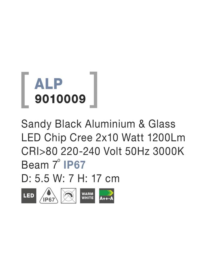 Срок на доставка: ПО ЗАПИТВАНЕ Продуктова информация Материал: Sandy Black Aluminium & Glass Тип крушка: LED Chip Cree 2×10 Watt 1200Lm, 220-240 Volt 50Hz 3000K Beam 7 degrees -IP67 Код: 9010009 Тип продукт: OUTDOOR – WALL WASHER Размери: D: 5.5 W: 7 H: 17 cm