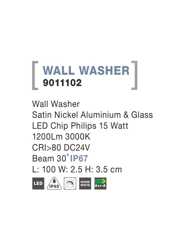 Wall Washer Satin Nickel Aluminium & Glass LED Chip Philips 15 Watt 746Lm 3000K DC24V Beam Angle 30o IP67 L: 100 W: 2.5 H: 3.5 cm