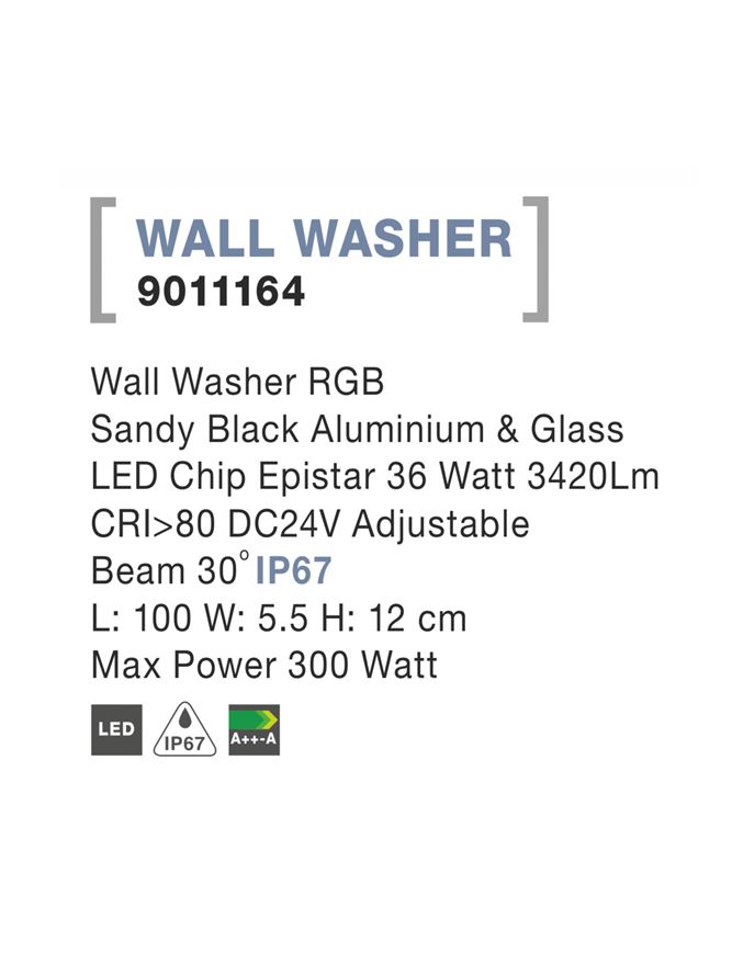 Wall Washer RGB Sandy Black Aluminium & Glass LED Chip Epistar 36 Watt 3420Lm DC24V Adjustable Beam Angle 30o IP67 L: 100 W: 5.5 H: 12 cm Max Power 300 Watt