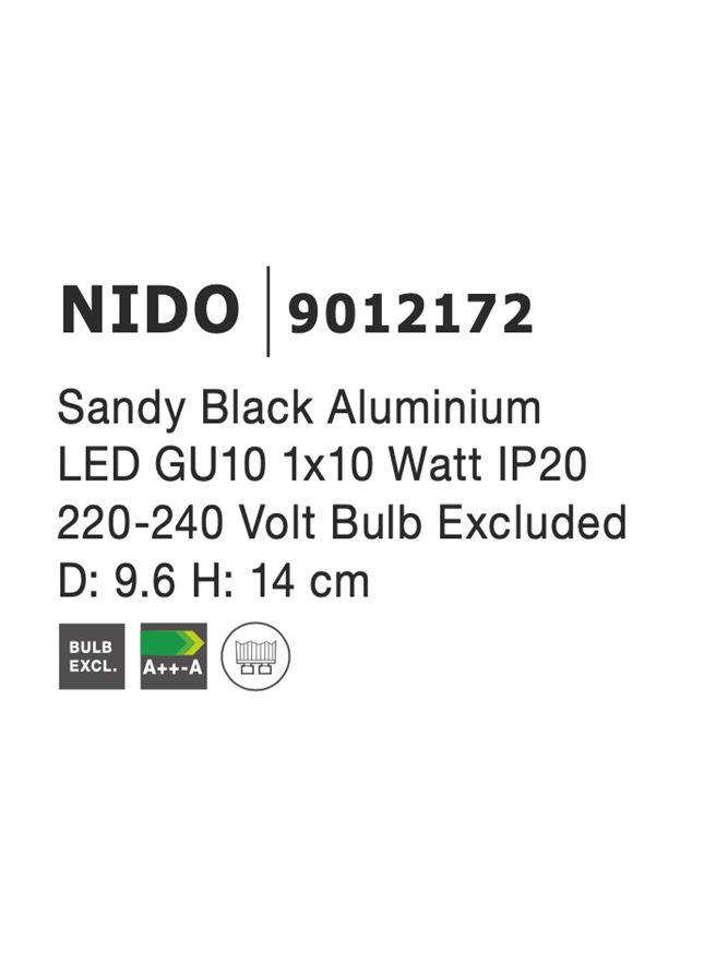 Срок на доставка: ПО ЗАПИТВАНЕ Продуктова информация Материал: Sandy Black Aluminium Тип крушка: LED GU10 1×10 Watt IP20 220-240 Volt Bulb Excluded Код: 9012172 Тип продукт: GU10 AND LED SPOTS Размери: D: 9.6 H: 14 cm