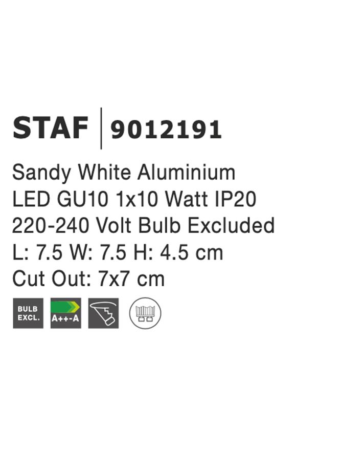 Срок на доставка: ПО ЗАПИТВАНЕ Продуктова информация Материал: Sandy White Aluminium Тип крушка: LED GU10 1×10 Watt IP20 220-240 Volt Bulb Excluded Код: 9012191 Тип продукт: GU10 AND LED SPOTS Размери: L: 7.5 W: 7.5 H: 4.5 cm Cut Out: 7×7 cm