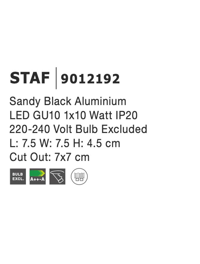 Срок на доставка: ПО ЗАПИТВАНЕ Продуктова информация Материал: Sandy Black Aluminium Тип крушка: LED GU10 1×10 Watt IP20 220-240 Volt Bulb Excluded Код: 9012192 Тип продукт: GU10 AND LED SPOTS Размери: L: 7.5 W: 7.5 H: 4.5 cm Cut Out: 7×7 cm 4
