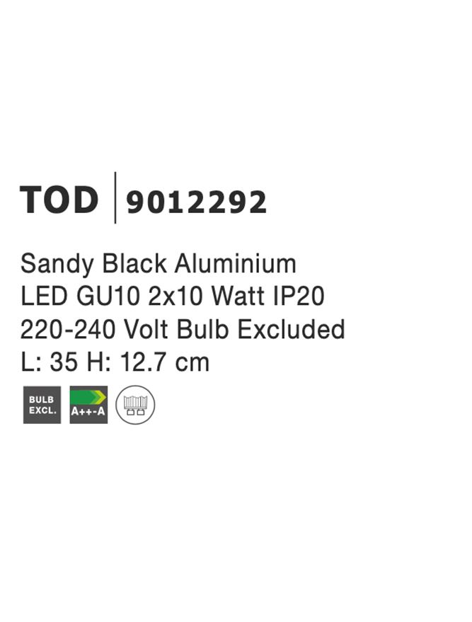 Срок на доставка: ПО ЗАПИТВАНЕ Продуктова информация Материал: Sandy Black Aluminium Adjustable Тип крушка: LED GU10 2×10 Watt IP20 220-240 Volt Bulb Excluded Код: 9012292 Тип продукт: GU10 AND LED SPOTS Размери: L: 35 W: 6 H: 12.7 cm