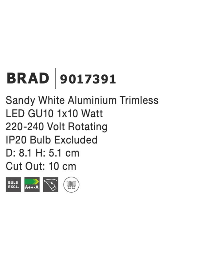 Срок на доставка: ПО ЗАПИТВАНЕ Продуктова информация Материал: Sandy White Aluminium Trimless, Rotating Тип крушка: GU10 1×50 Watt 60Hz 220-240 Volt Adjustable IP20 Bulb Excluded Код: 9017391 Тип продукт: GU10 AND LED SPOTS Размери: D: 8.1 H: 5.1 cm Cut Out: 10 cm