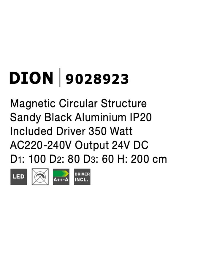 Magnetic Circular Structure Sandy Black Aluminium IP20 Included Driver 350 Watt AC220-240V Output 24V DC D1: 100 D2: 80 D3: 60 H: 200 cm