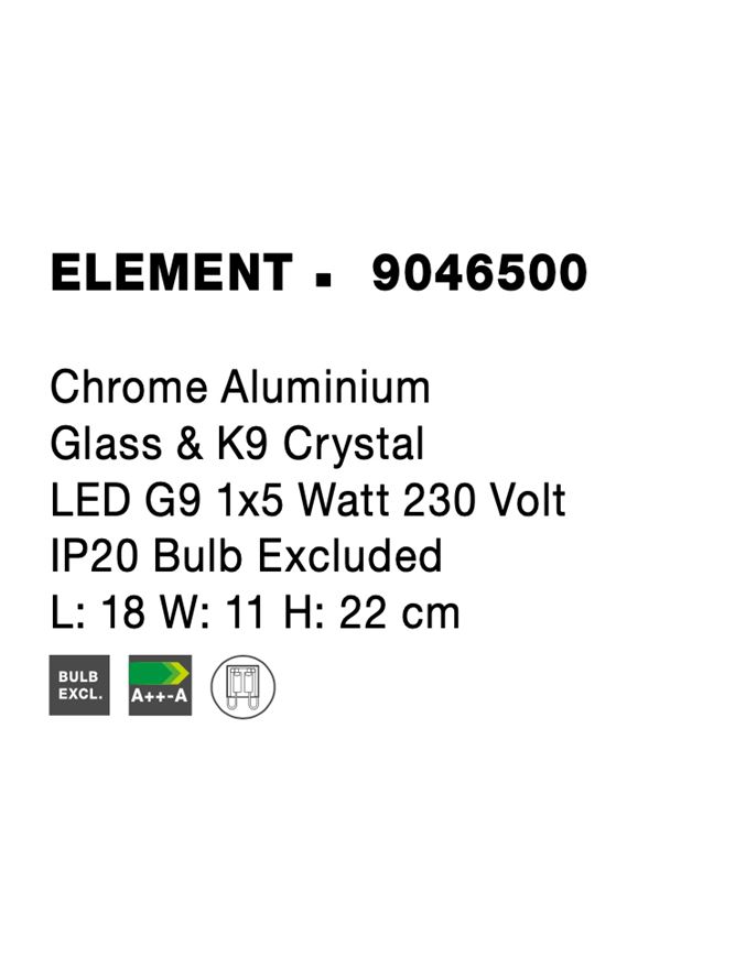 Срок на доставка: ПО ЗАПИТВАНЕ Продуктова информация Материал: Chrome Aluminium Glass & K9 Crystal Тип крушка: LED G9 1×5 Watt 230 Volt IP20 Bulb Excluded Код: 9046500 Тип продукт: CRYSTAL Размери: L: 18 W: 11 H: 22 cm