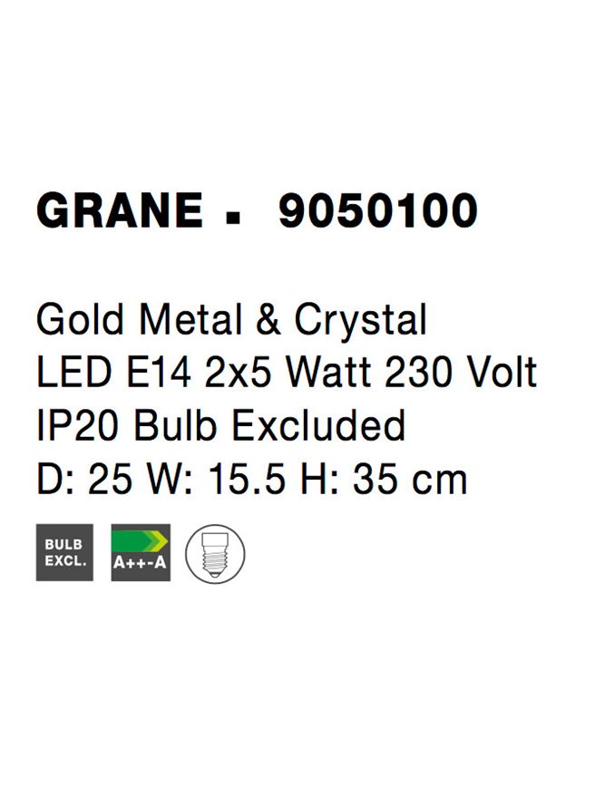 Срок на доставка: ПО ЗАПИТВАНЕ Продуктова информация Материал: Gold Metal & Crystal Тип крушка: LED E14 2x5W 230V IP20 Bulb Excluded Код: 9050100 Тип продукт: CHANDELIERS Размери: D: 25 W: 15.5 H: 35 cm