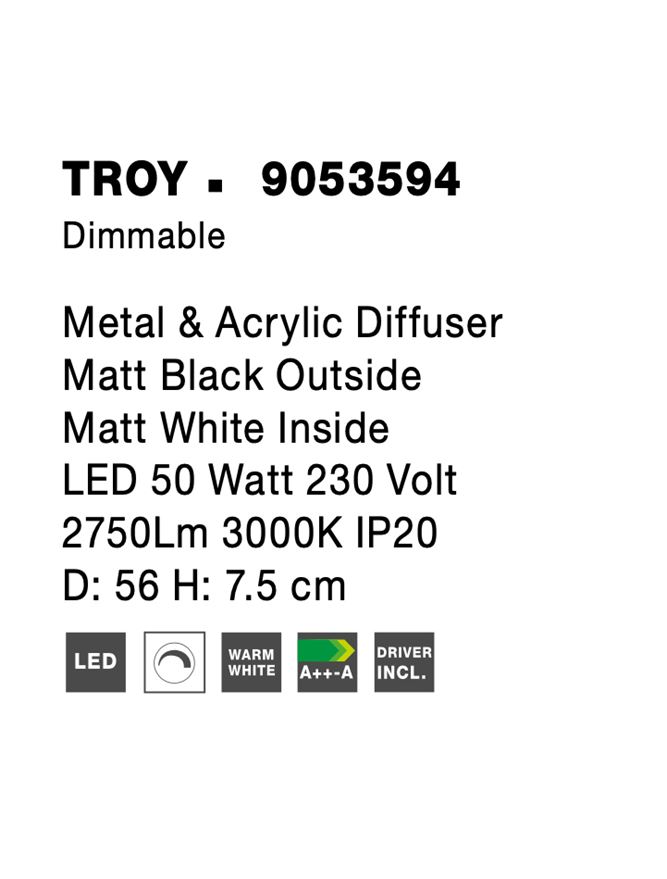 Срок на доставка: ПО ЗАПИТВАНЕ Продуктова информация Материал: Metal & Acrylic Diffuser Matt Black Outside Matt White Inside Тип крушка: LED 50 Watt 230 Volt 2750Lm 3000K IP20 Код: 9053594 Тип продукт: COMFORT Размери: D: 56 H: 7.5 cm