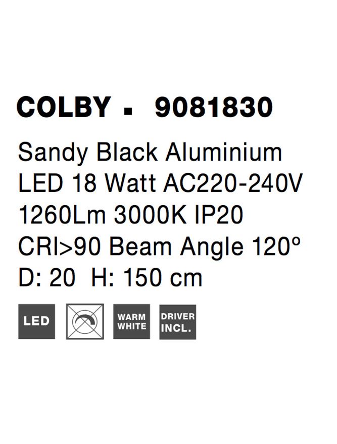 Sandy Black Aluminium LED 18 Watt AC220-240V 1260Lm 3000K IP20 D: 20 H: 150 cm
