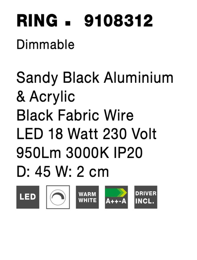 Sandy Black Aluminium & Acrylic Black Fabric Wire LED 18 Watt 230 Volt 950Lm 3000K IP20 D: 45 W: 2 cm