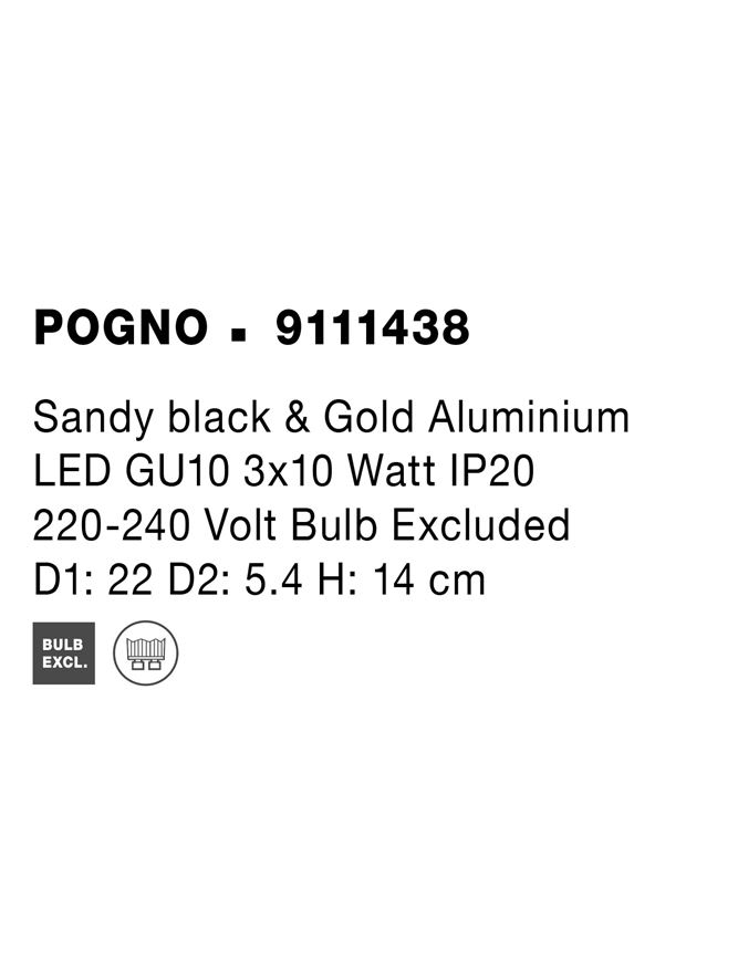 Срок на доставка: ПО ЗАПИТВАНЕ Продуктова информация Материал: Sandy black & Gold Aluminium Тип крушка: LED GU10 3×10 Watt IP20 220-240 Volt Bulb Excluded Код: 9111438 Тип продукт: CEILING LUMINAIRES Размери: D1: 22 D2: 5.4 H: 14 cm