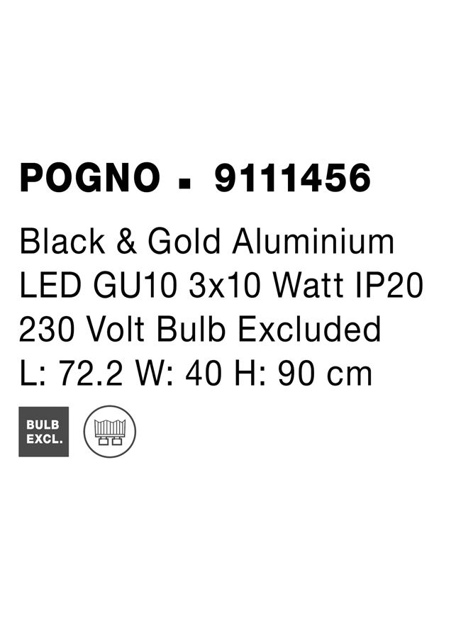 Срок на доставка: ПО ЗАПИТВАНЕ Продуктова информация Материал: Black & Gold Aluminium Тип крушка: LED GU10 3×10 Watt IP20 230 Volt Bulb Excluded Код: 9111456 Тип продукт: MODERN PENDANT LUMINAIRES Размери: L: 72.2 W: 40 H: 90 cm