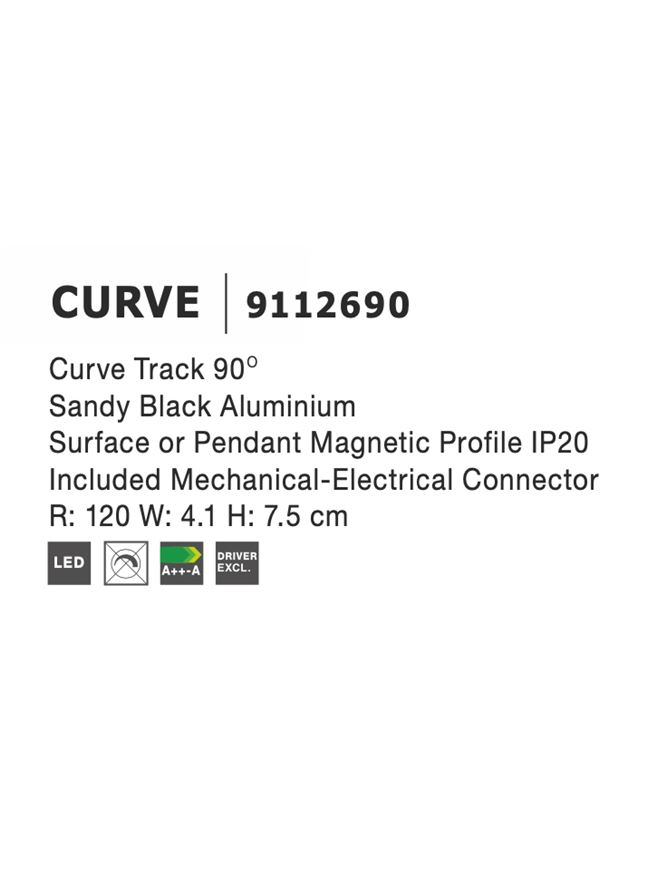 Срок на доставка: ПО ЗАПИТВАНЕ Продуктова информация Материал: Curve Track 90O Sandy Black Aluminium Surface or Pendant Magnetic Profile Тип крушка: P20 Included Mechanical-Electrical Connector Код: 9112690 Тип продукт: MAGNETIC – DECORATIVE Размери: R: 120 W: 4.1 H: 7.5 cm