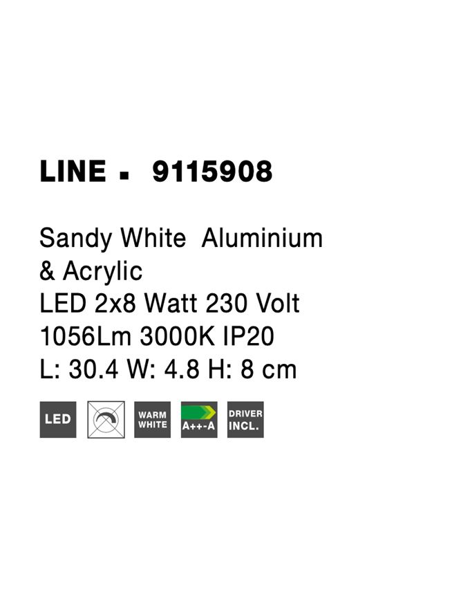 Sandy White Aluminium & Acrylic LED 2×8 Watt 230 Volt 1056Lm 3000K IP20 L: 30.4 W: 11.8 H: 11.8 cm