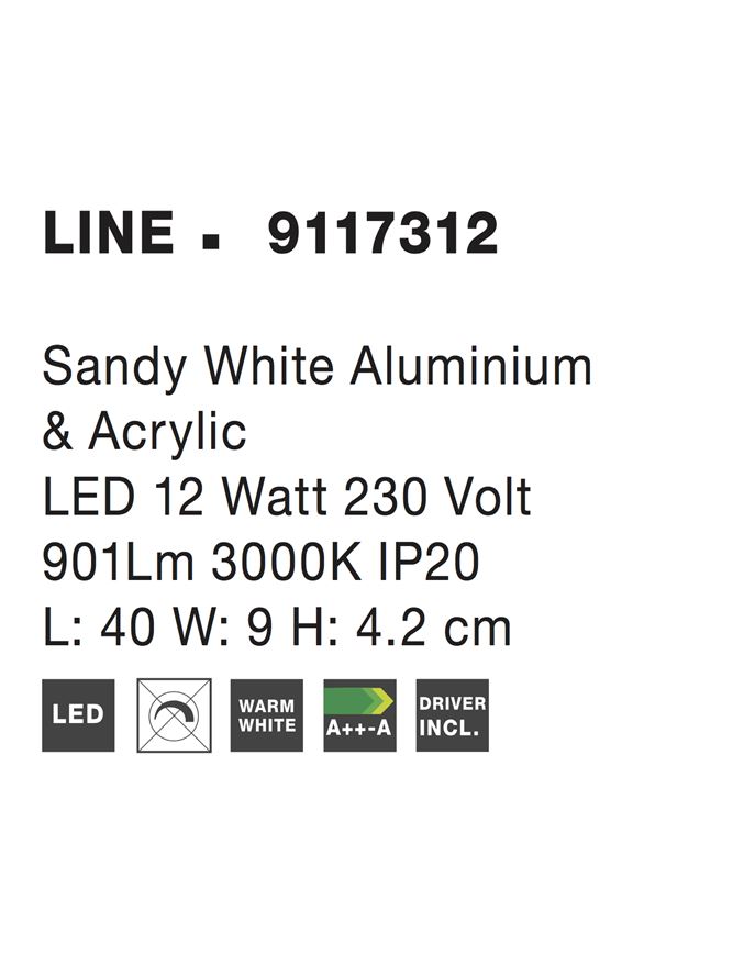 Sandy White Aluminium & Acrylic LED 12 Watt 230 Volt 901Lm 3000K IP20 L: 40 W: 9 H: 4.2 cm