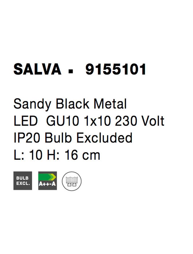 Срок на доставка: ПО ЗАПИТВАНЕ Продуктова информация Материал: Sandy Black Metal Тип крушка: LED GU10 1x10W 230V IP20 Bulb Excluded Код: 9155101 Тип продукт: SPOT Размери: L: 10 H: 16 cm