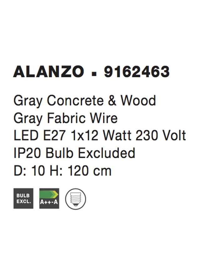 Gray Concrete & Wood Gray Fabric Wire LED E27 1×12 Watt 230 Volt IP20 Bulb Excluded D: 10 H: 120 cm