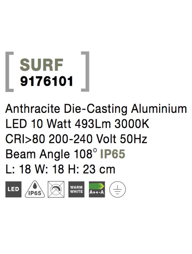 Anthracite Die-Casting Aluminium LED 8 Watt 440Lm 3000K 200-240 Volt 50Hz Beam Angle 108 O IP65 L: 18 W: 18 H: 23 cm