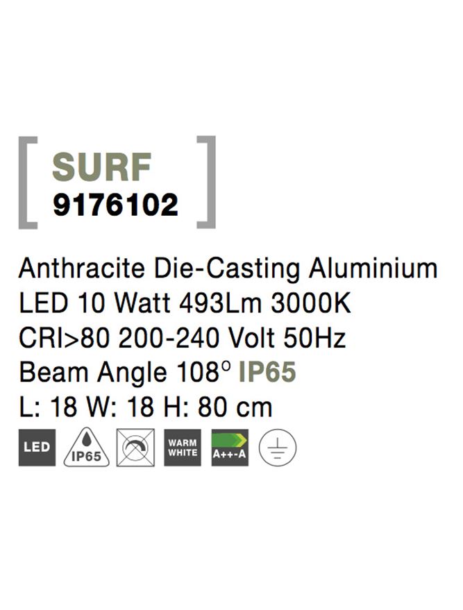 Anthracite Die-Casting 512Lm 3000K 200-240 Volt 50Hz Beam Angle 108O IP65 L: 18 W: 18 H: 80 cm