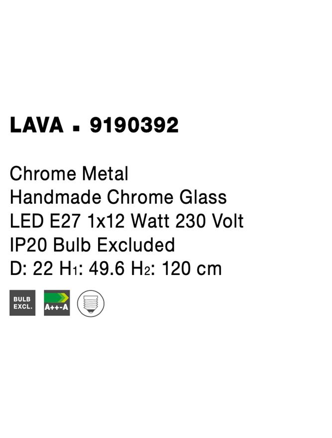 Срок на доставка: ПО ЗАПИТВАНЕ Продуктова информация Материал: Chrome Metal Handmade Chrome Glass Тип крушка: LED E27 1×12 Watt 230 Volt IP20 Bulb Excluded Код: 9190392 Тип продукт: LUNAR Размери: D: 22 H1: 49.6 H2: 120 cm