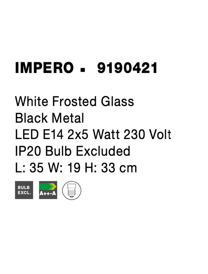 Срок на доставка: ПО ЗАПИТВАНЕ Продуктова информация Материал: White Frosted Glass Black Metal Тип крушка: LED G9 2×5 Watt 230 Volt IP20 Bulb Excluded Код: 9190421 Тип продукт: NOUVELLE Размери: L: 35 W: 19 H: 33 cm