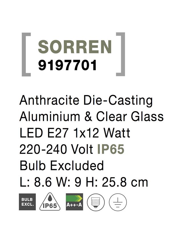 Anthracite Die-Casting Aluminium & Clear Glass LED E27 1×12 Watt 220-240 Volt Bulb Excluded IP65 L: 8.6 W: 9 H: 25.8 cm