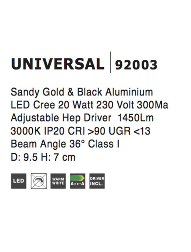 Срок на доставка: ПО ЗАПИТВАНЕ Продуктова информация Материал: Sandy Gold & Black Aluminium Тип крушка: IP20 3000K 20W 240V 1450Lm Код: 92003 Тип продукт: DOWNLIGHT RECESSED SPOTS Размери: D:9.5 H:7