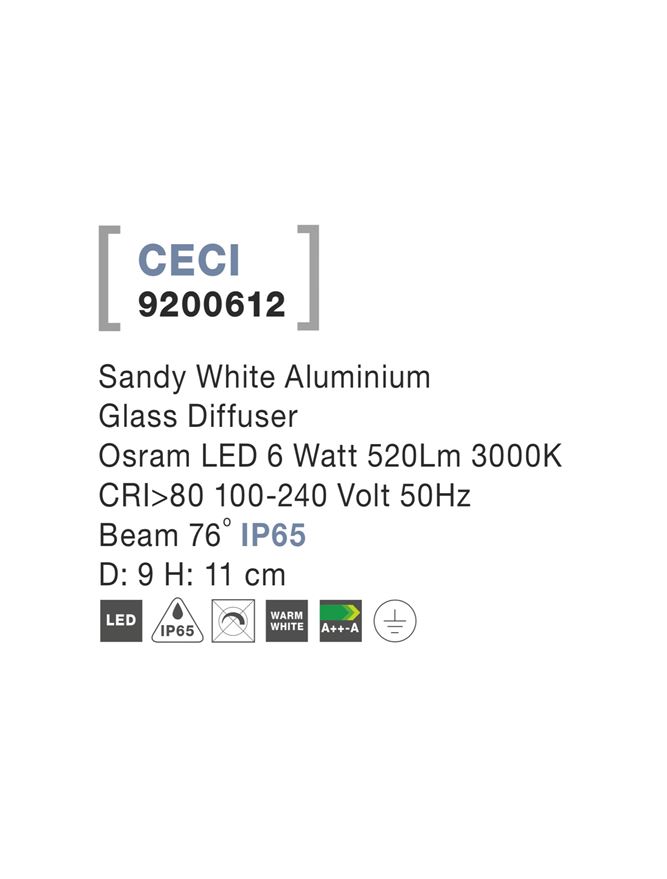 Sandy White Aluminium Glass Diffuser Osram LED 6 Watt 520Lm 3000K 100-240 Volt 50Hz Beam 76 o IP65 D: 9 H: 11 cm