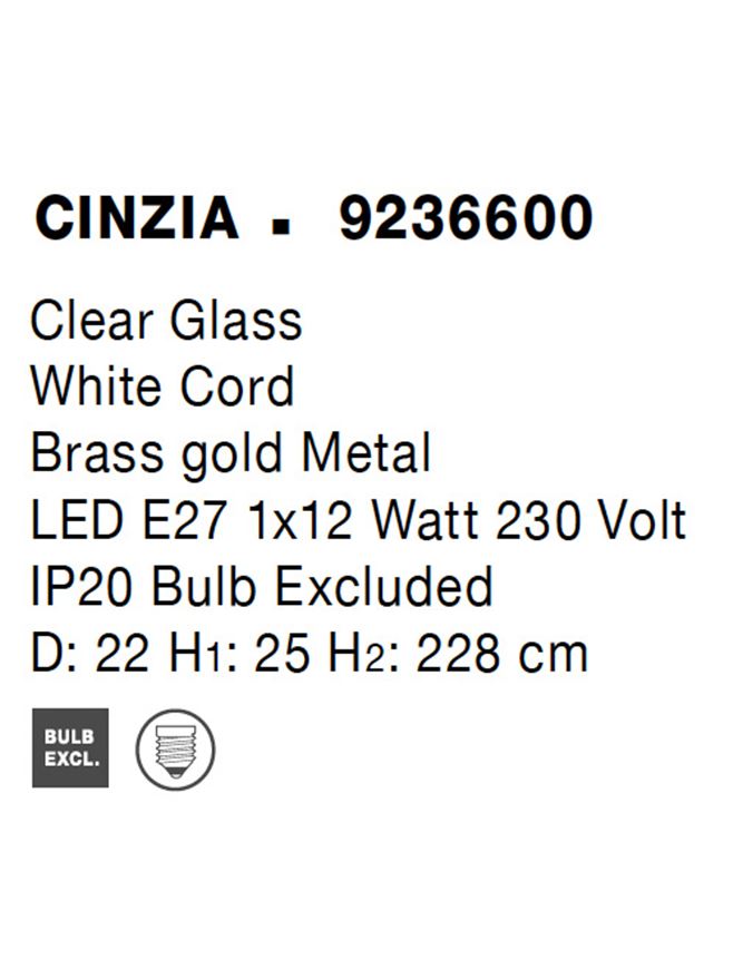 Срок на доставка: ПО ЗАПИТВАНЕ Продуктова информация Материал: Clear Glass & White Cord & Brass gold Metal Тип крушка: LED E27 1×12 Watt 230 Volt IP20 Bulb Excluded Код: 9236600 Тип продукт: MODERN PENDANT LUMINAIRES Размери: D: 22 H1: 25 H2: 228 cm