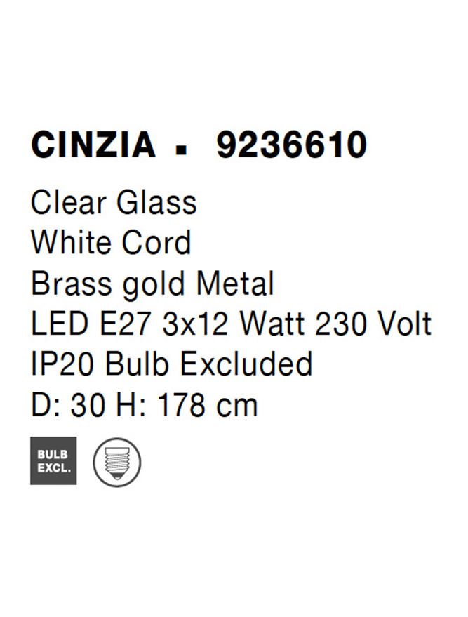 Срок на доставка: ПО ЗАПИТВАНЕ Продуктова информация Материал: Clear Glass & White Cord & Brass gold Metal Тип крушка: LED E27 3×12 Watt 230 Volt IP20 Bulb Excluded Код: 9236610 Тип продукт: MODERN PENDANT LUMINAIRES Размери: D: H1: H2: cm