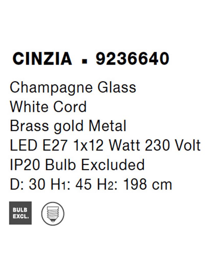 Срок на доставка: ПО ЗАПИТВАНЕ Продуктова информация Материал: Champagne Glass & White Cord & Brass gold Metal Тип крушка: LED E27 1×12 Watt 230 Volt IP20 Bulb Excluded Код: 9236640 Тип продукт: MODERN PENDANT LUMINAIRES Размери: D: 30 H1: 45 H2: 198 cm