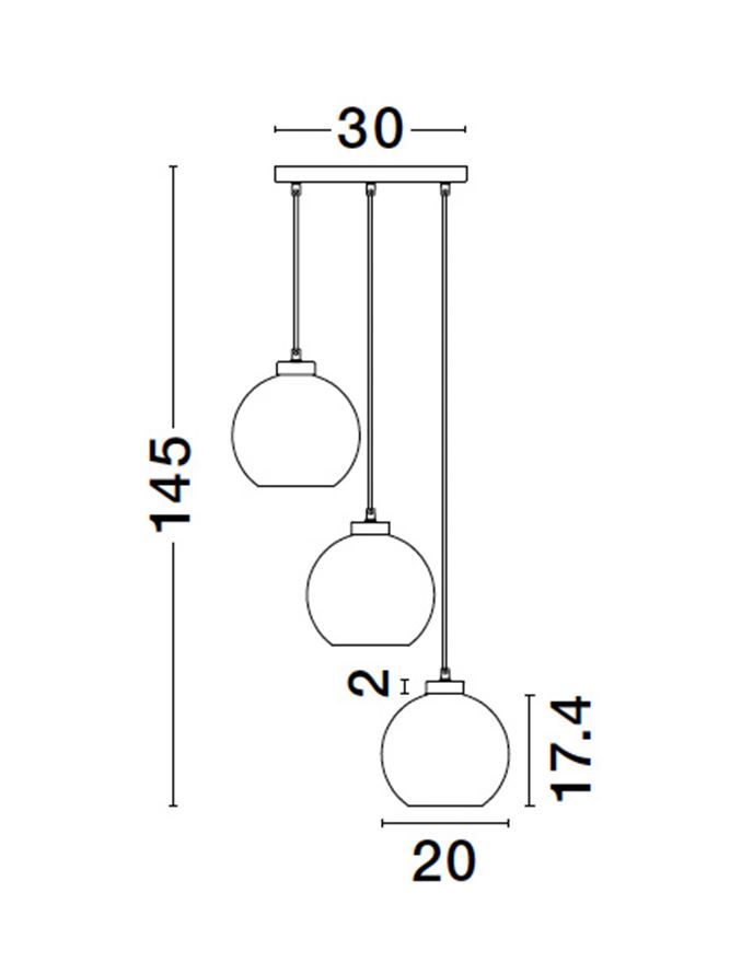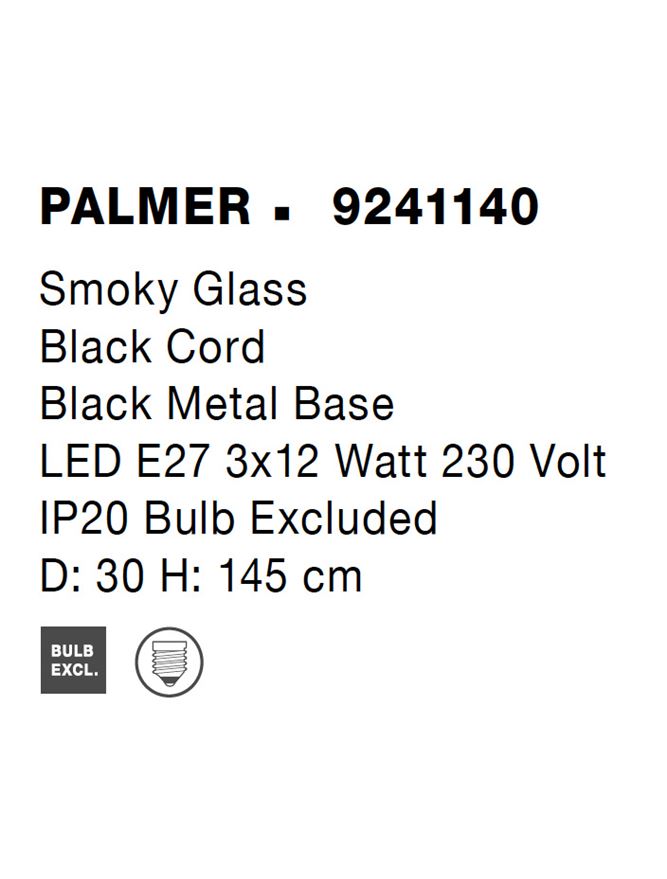 Срок на доставка: ПО ЗАПИТВАНЕ Продуктова информация Материал: Smoky Glass & Black Cord & Black Metal Base Тип крушка: LED E27 3×12 Watt 230 Volt IP20 Bulb Excluded Код: 9241140 Тип продукт: MODERN PENDANT LUMINAIRES Размери: D: 20 H1: 17.4 H2: 145 cm