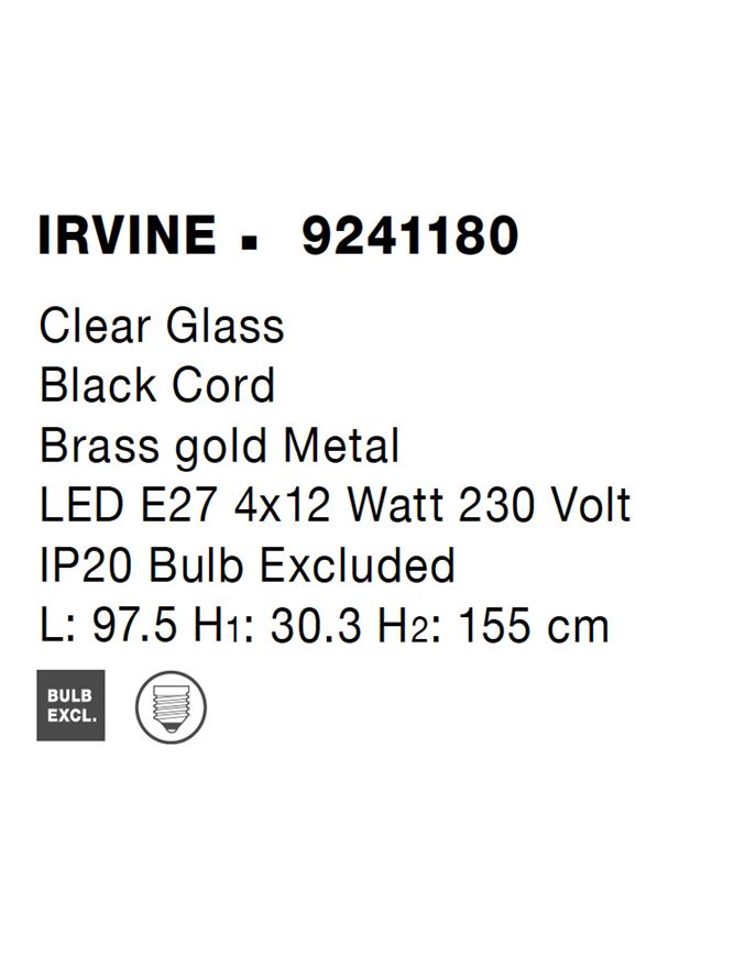 Срок на доставка: ПО ЗАПИТВАНЕ Продуктова информация Материал: Clear Glass & Black Cord & Brass gold Metal Тип крушка: LED E27 4×12 Watt 230 Volt IP20 Bulb Excluded Код: 9241180 Тип продукт: MODERN PENDANT LUMINAIRES Размери: L: 97.5 H1: 30.3 H2: 155 cm
