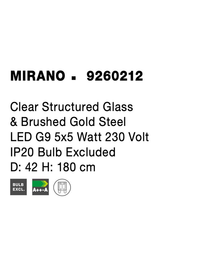 Срок на доставка: ПО ЗАПИТВАНЕ Продуктова информация Материал: Clear Structured Glass & Brushed Gold Steel Тип крушка: LED G9 5×5 Watt 230 VoltIP20 Bulb Excluded Код: 9260212 Тип продукт: NOUVELLE Размери: D: 42 H: 180 cm