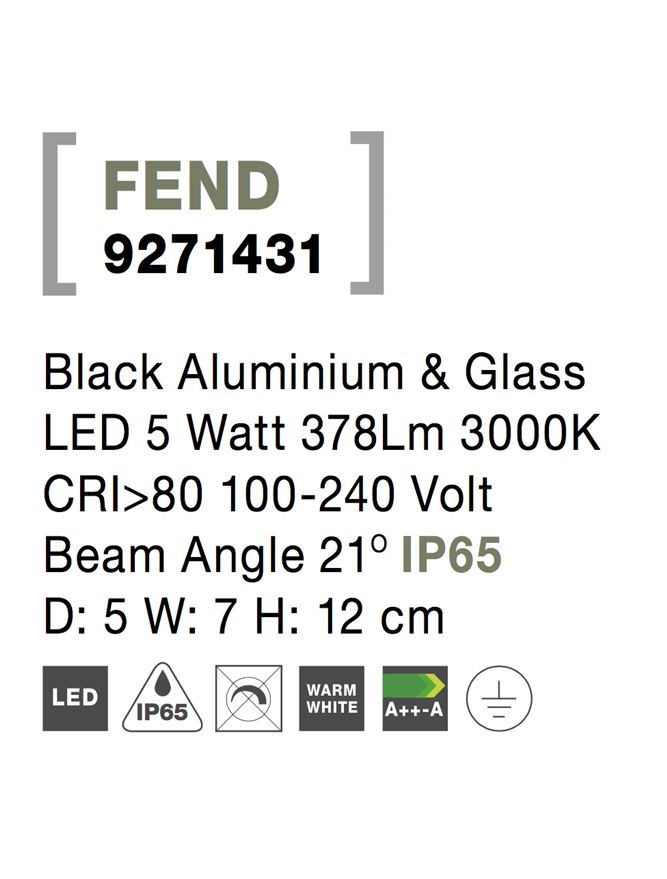 Black Aluminium & Glass LED 5 Watt 378Lm 3000K 100-240 Volt Beam Angle 21O IP65 D: 5 W: 7 H: 12 cm