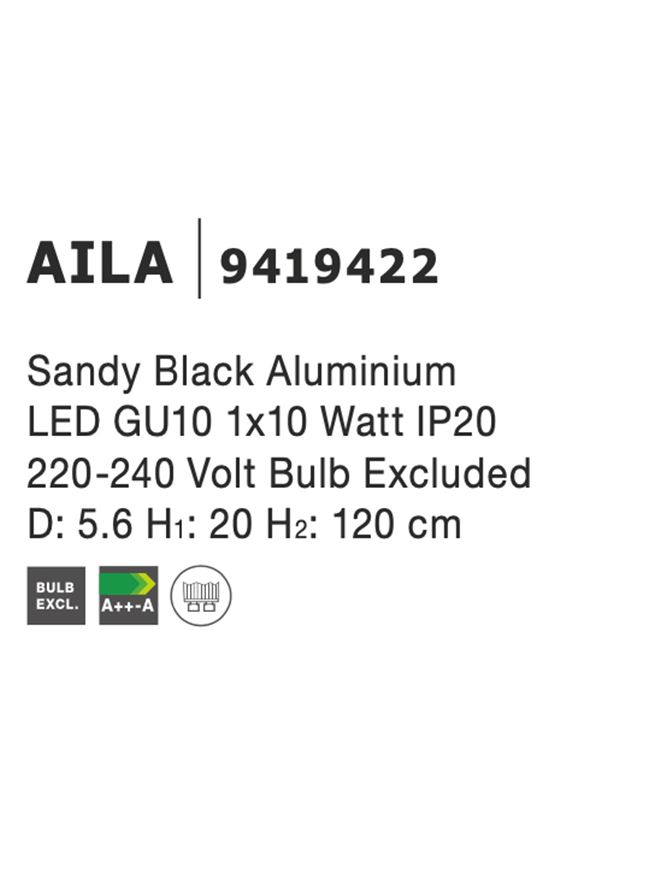 Sandy Black Aluminium LED GU10 1×10 Watt IP20 220-240 Volt Bulb Excluded D: 5.6 H1: 20 H2: 120 cm