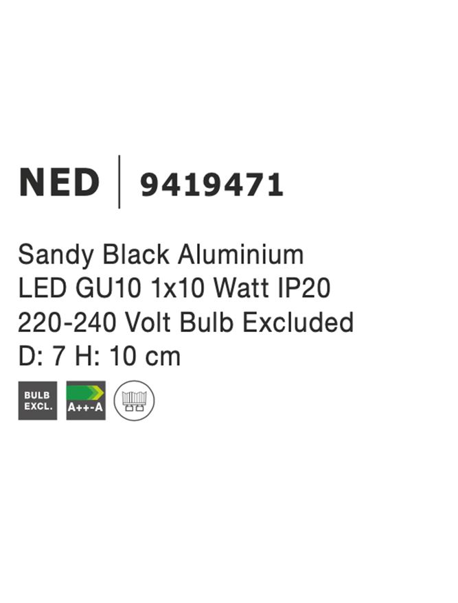 Срок на доставка: ПО ЗАПИТВАНЕ Продуктова информация Материал: Sandy Black Aluminium Тип крушка: LED GU10 1×10 Watt IP20 220-240 Volt Bulb Excluded Код: 9419471 Тип продукт: GU10 AND LED SPOTS Размери: D: 7 H: 10 cm