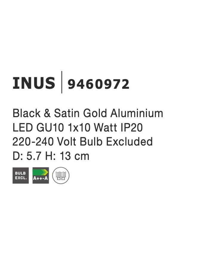 Срок на доставка: ПО ЗАПИТВАНЕ Продуктова информация Материал: Black & Satin Gold Aluminium Тип крушка: LED GU10 1×10 Watt IP20 220-240 Volt Bulb Excluded Код: 9460972 Тип продукт: GU10 AND LED SPOTS Размери: D: 5.7 H: 13 cm